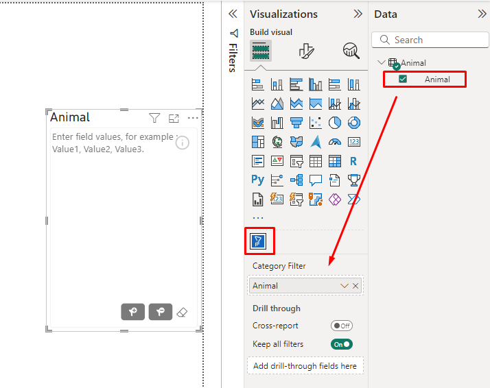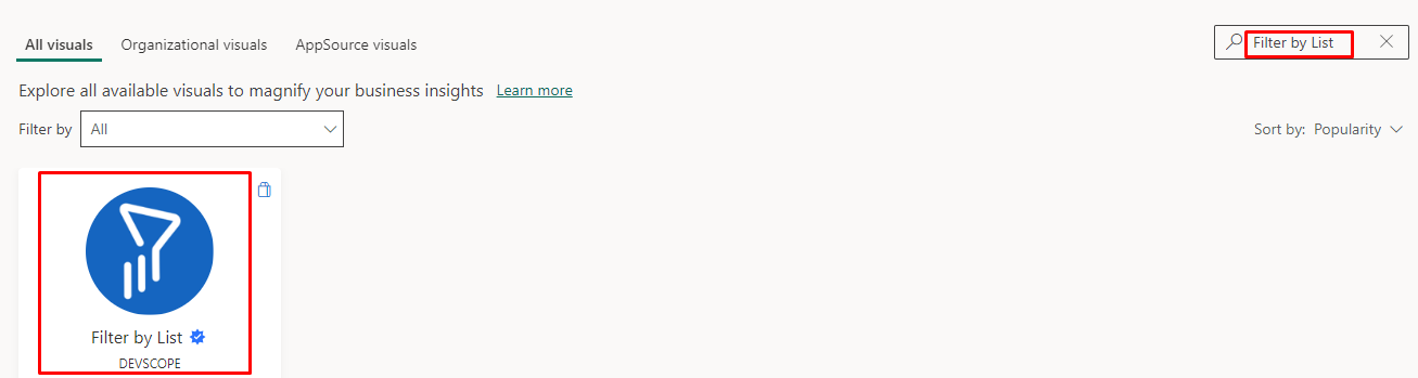 Before using you need to add the Filter by List custom visual to your report. First on the Visualizations Panel click on "..." and 'Get more visuals':